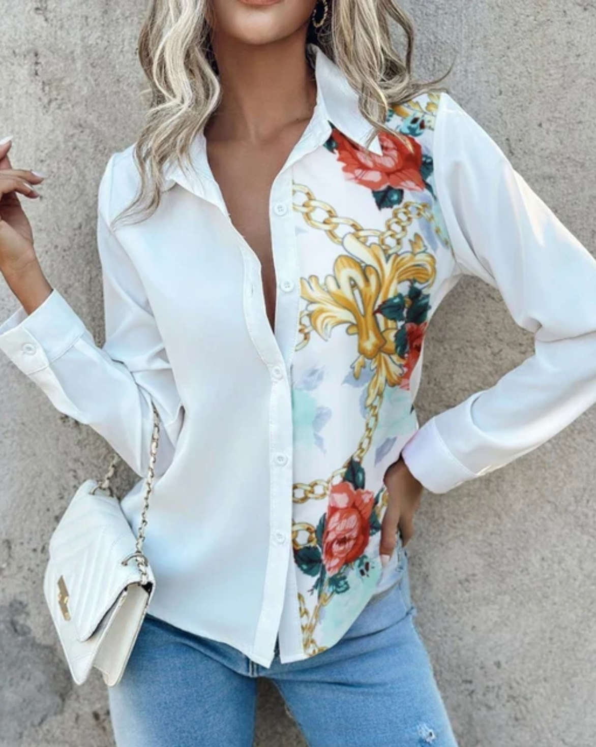 Peppen Sie Ihre Garderobe mit dieser atemberaubenden langärmeligen Bluse mit exquisitem Blumen- und Kettenmuster auf. Das auffällige Muster auf einer Seite bildet einen auffälligen Kontrast zu dem strahlend weißen Hintergrund und macht diese Bluse zu einem auffälligen Stück. Mit ihrem klassischen Kragen und der geknöpften Vorderseite verbindet sie mühelos Eleganz und modernes Flair. Diese Bluse eignet sich sowohl für legere als auch für elegante Anlässe und lässt sich wunderbar mit Jeans, Röcken oder maßgeschneiderten Hosen kombinieren.