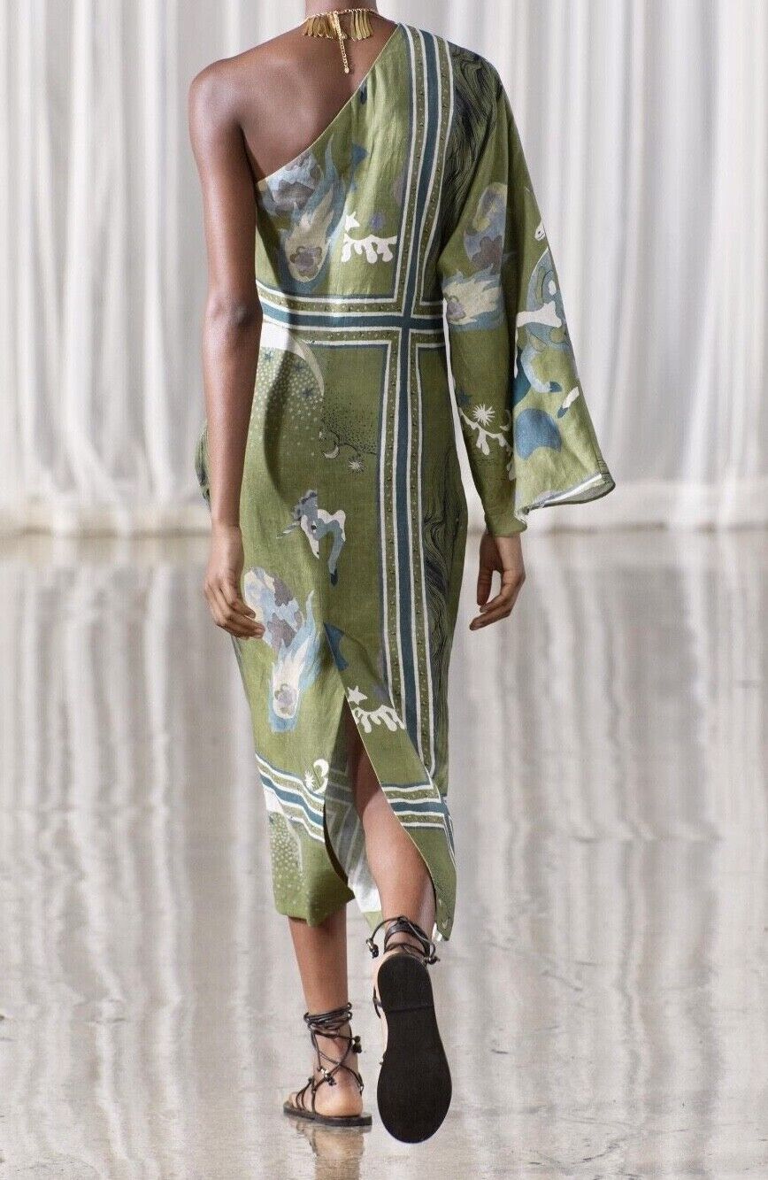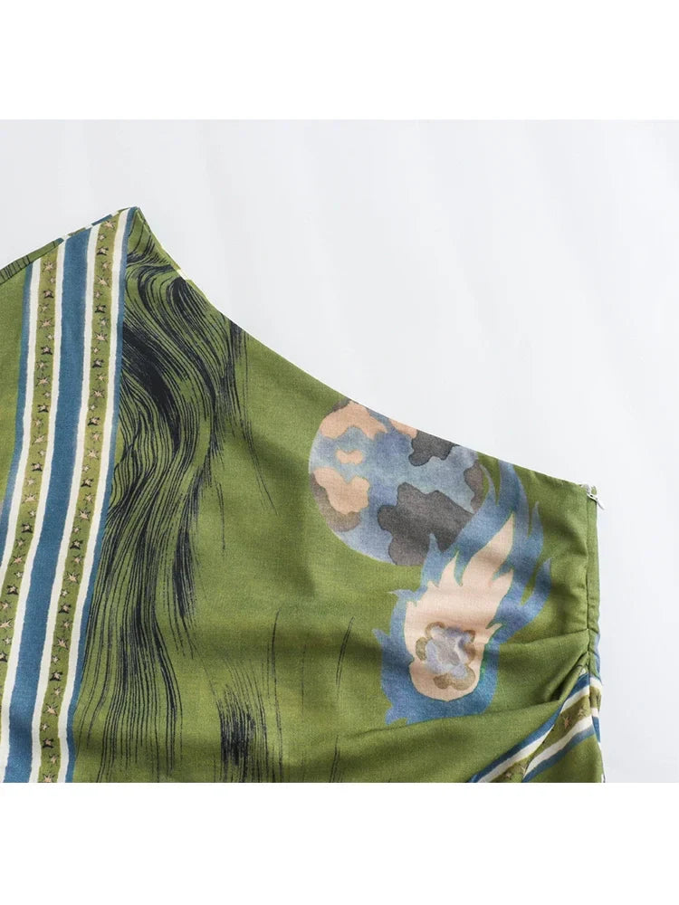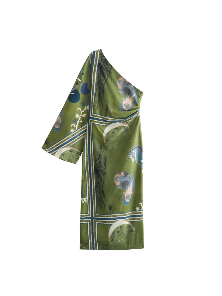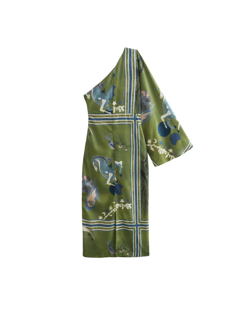Setzen Sie ein mutiges Statement mit unserem asymmetrischen One-Shoulder-Midi-Dress, einer perfekten Mischung aus moderner Raffinesse und künstlerischem Flair. Dieses atemberaubende Kleid besteht aus einem auffälligen grünen Stoff, der mit einem komplizierten, von der Natur inspirierten Druck verziert ist. Das einzigartige One-Shoulder-Design und die asymmetrischen Ärmel sorgen für eine markante Silhouette, die sowohl modern als auch elegant ist, Die lockere Passform sorgt für Komfort und Bewegungsfreiheit.