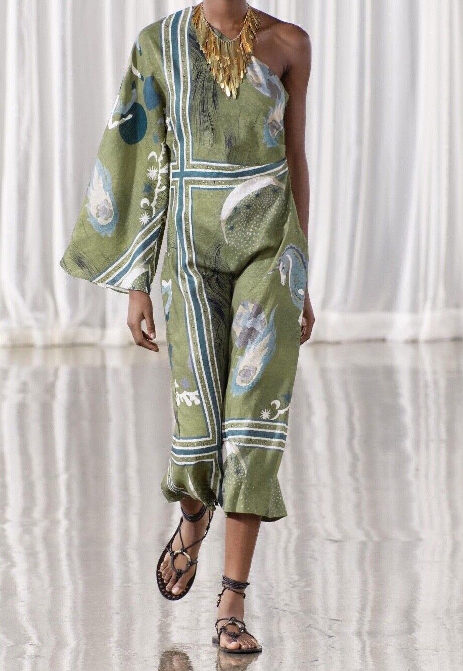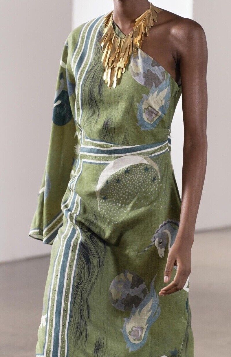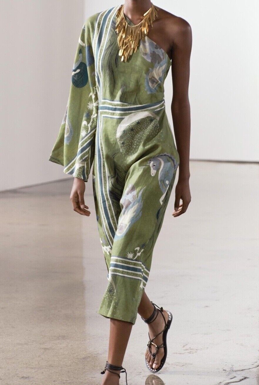 Setzen Sie ein mutiges Statement mit unserem asymmetrischen One-Shoulder-Midi-Dress, einer perfekten Mischung aus moderner Raffinesse und künstlerischem Flair. Dieses atemberaubende Kleid besteht aus einem auffälligen grünen Stoff, der mit einem komplizierten, von der Natur inspirierten Druck verziert ist. Das einzigartige One-Shoulder-Design und die asymmetrischen Ärmel sorgen für eine markante Silhouette, die sowohl modern als auch elegant ist, Die lockere Passform sorgt für Komfort und Bewegungsfreiheit.