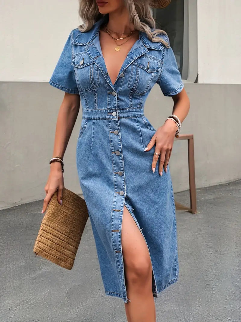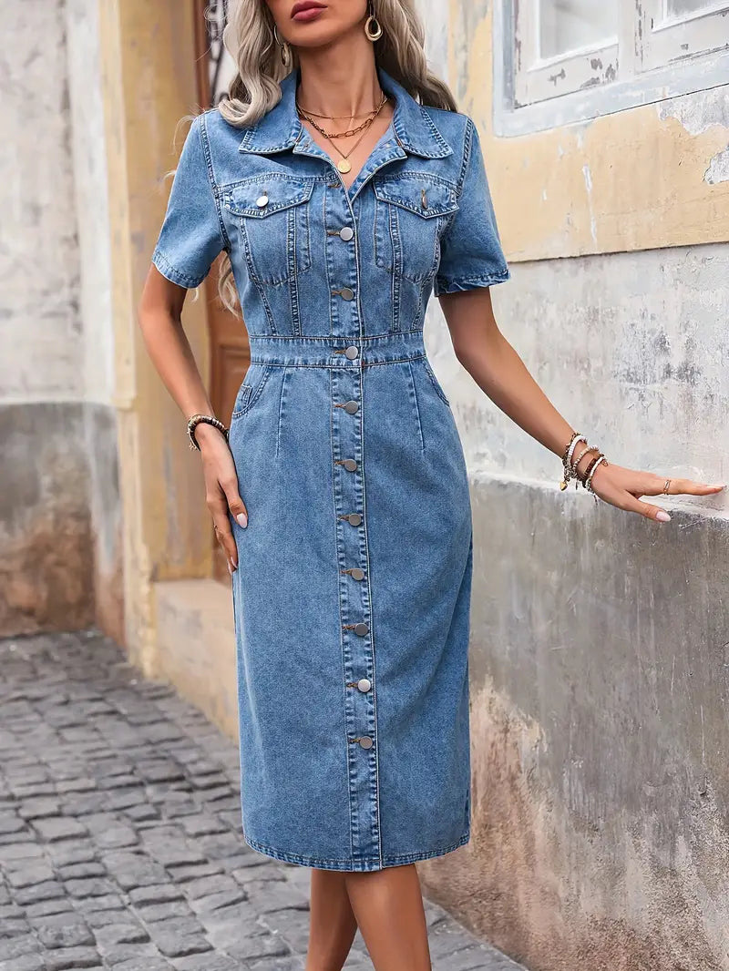 Dieses schicke Midikleid aus Denim ist zeitlos und verleiht Ihrer Freizeitgarderobe einen Hauch von Raffinesse. Mit seiner schmeichelhaften Button-Down-Front und der taillierten Passform betont dieses Kleid Ihre Kurven und sorgt gleichzeitig für einen eleganten Look. Die kurzen Ärmel und der Halsausschnitt mit Kragen verleihen dem Kleid einen klassischen Touch und machen es vielseitig genug, um es sowohl tagsüber als auch abends zu tragen.